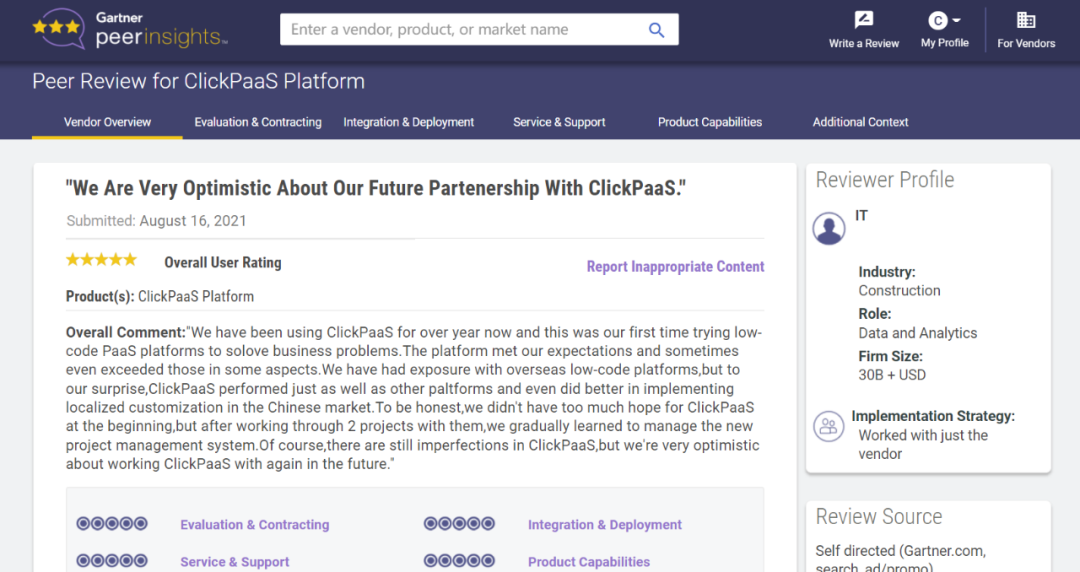 Tips:::【Peer Insights】——用户对企业IT产品和服务发布真实评价的平台。。。。目前已有355个市场,,255,000条经过验证的评价。。。。每一条评价Gartner会针对参评企业营收规模及参评人员信息做验证、、、、评价内容做多维核实。。。。